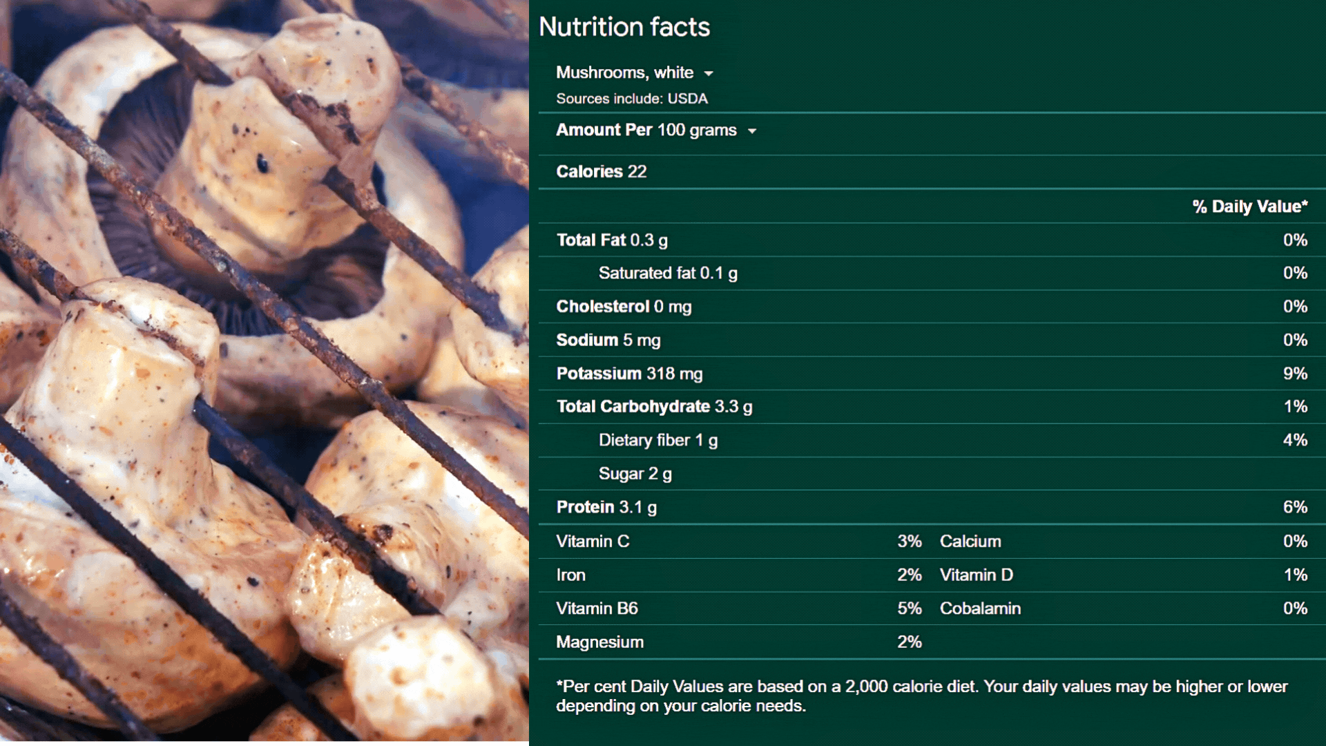 Total energy Per 100gm: 22 Kcal, 90 kJ